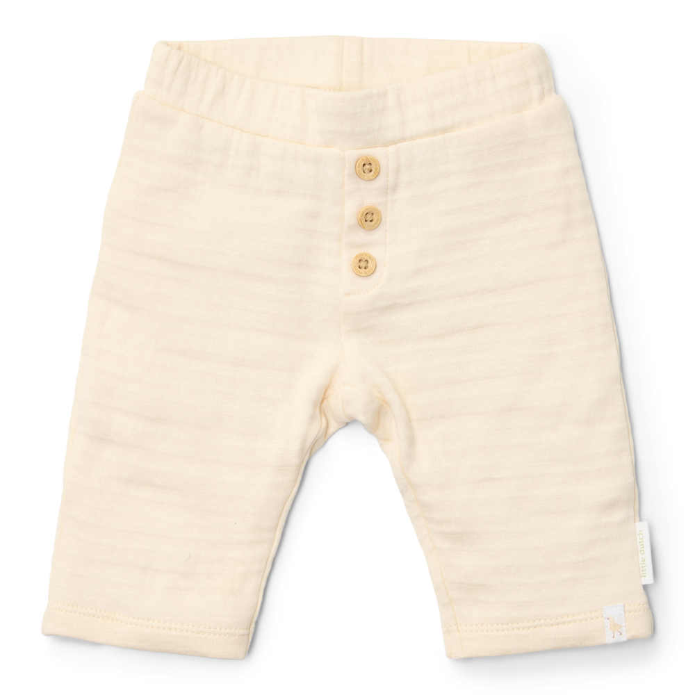 Diese cremefarbene Hose ist die perfekte Mischung aus Komfort und Stil für Ihr Kleines. Sie besteht aus zwei dünnen Schichten weichen Stoffes, was nicht nur warm anfühlt, sondern auch einen subtilen und raffinierten Effekt verleiht. Die Holzknöpfe sind ein nettes Detail, während der elastische Bund dafür sorgt, dass die Hose gut sitzt. Hergestellt aus Bio-Baumwolle und Oekotex-zertifiziert, also freundlich zur Haut und zum Planeten. Erhältlich in den Größen 44 bis 74, ideal für jeden kleinen Abenteurer.