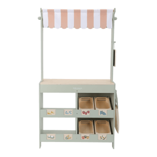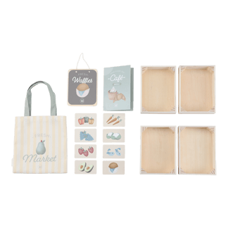 Mit diesem wunderschönen hölzernen Marktstand können Kinder ihren eigenen kleinen Laden eröffnen. Die Stoffmarkise sorgt für eine authentische Marktstimmung, und mit der Kreidetafel sowie den illustrierten Preisschildern lassen sich die Produkte schön präsentieren. Das Set enthält außerdem eine Einkaufstasche und Kisten für ein echtes Einkaufserlebnis. Dreht man den Marktstand um, wird er zu einem Café mit Speisekarte und fröhlichen Illustrationen. Kombiniere ihn mit der Kasse, der Waage oder einer Etagere mit Gebäck für noch mehr Spielspaß. Was steht heute auf der Speisekarte?