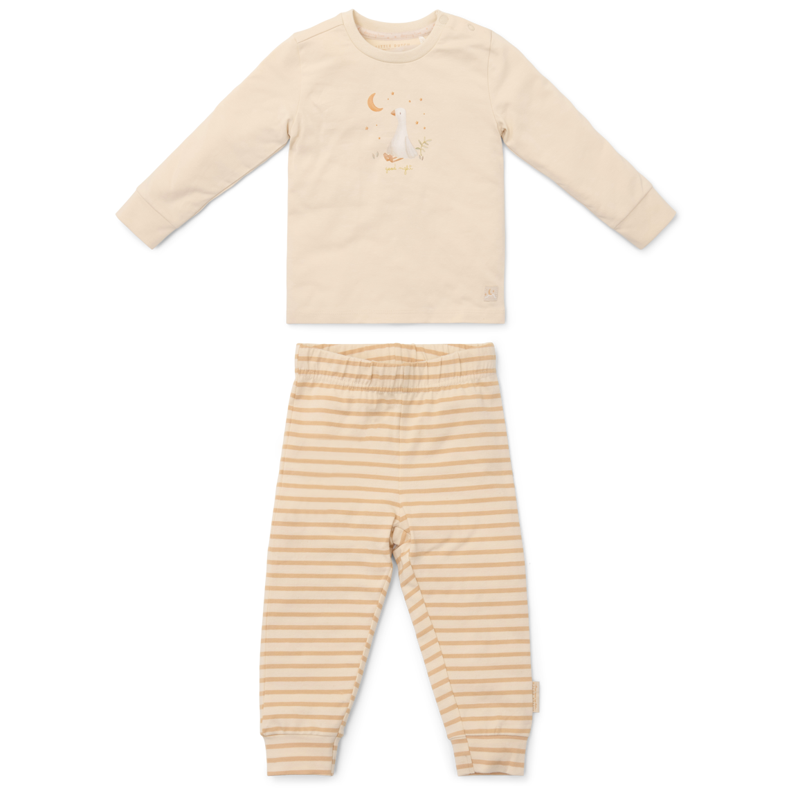 Sleepy Baby Gans: Ein Schlafanzug, der mit neutralen Tönen und einer kuscheligen Gans zum Einschlafen einlädt. Die Hose dieses zweiteiligen Sets ist weiß-beige gestreift und wird durch ein charmantes Baby-Gänse-Motiv auf dem cremefarbenen Hemd ergänzt. Der Schlafanzug ist auf die passende Bettwäsche abgestimmt und besteht aus Baumwolle (Bio), die weich und bequem für die empfindliche Haut Ihres Kindes ist. Verpackt in einer schönen Geschenkbox und erhältlich in den Größen 62/68, 74/80, 86/92 und 98/104. Waschanleitung: Maschinenwäsche bei 30°C im Schonwaschgang; bei niedriger Temperatur auf links bügeln; nicht chemisch reinigen; nicht bleichen; nicht im Trockner trocknen Farbe: Sand Material: 96% Baumwolle (Bio) / 4% Elasthan Kollektion: Nightwear KollektionNatural Stripes