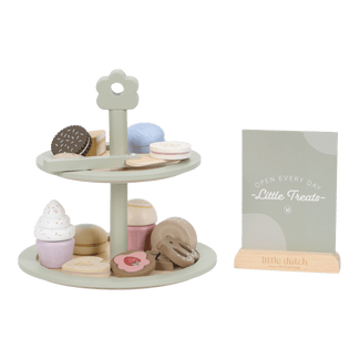 Teezeit! Mit dieser wunderschönen Holz-Etagere voller köstlicher Leckereien können Kinder eine fantastische High Tea servieren. Auf den drei Etagen findest du einen Muffin, Kekse und bunte Macarons – alle gleichermaßen verlockend. Nutze das mitgelieferte Tortenheberchen und die Menükarte mit Illustrationen, damit die Gäste ihre Wahl treffen können. Perfekt für fantasievolles Spielen und gemütliche Teemomente!