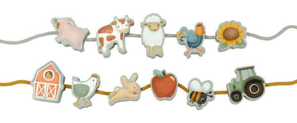 Set aus Perlen zum Auffädeln aus massivem Holz mit Bildern aus der Little Farm-Serie. inkl. verschiedenfarbige Fäden.