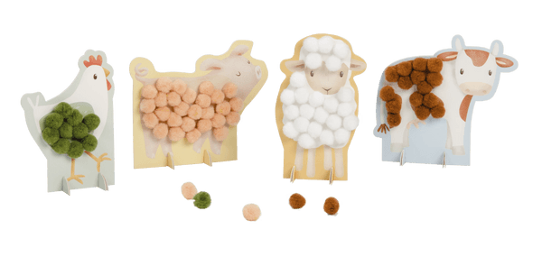 Set mit 4 vorgeschnittenen, mit Kleber bedruckten Karten und Pompons in verschiedenen Farben