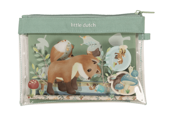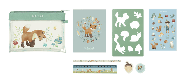 Forest Friends Schreibset, enthält Notizbuch, Aufkleber, Lineal, Radiergummi, Bleistiftspitzer und Schablonen.