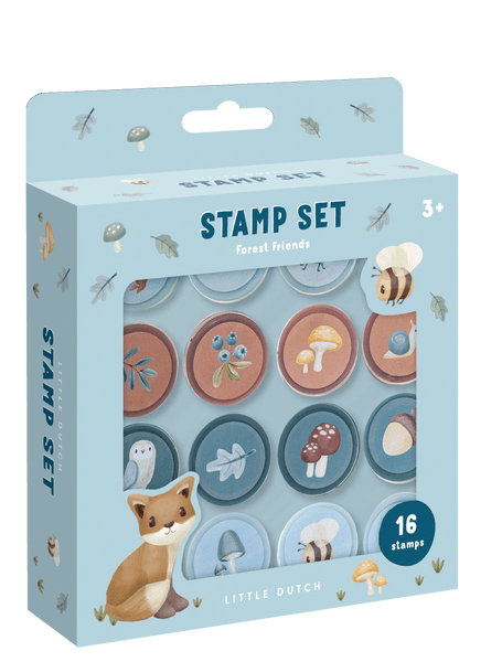 Stempelset Forest Friends, enthält 16 selbstfärbende Stempfel pro Packung mit Waldtieren und Illustrationen.